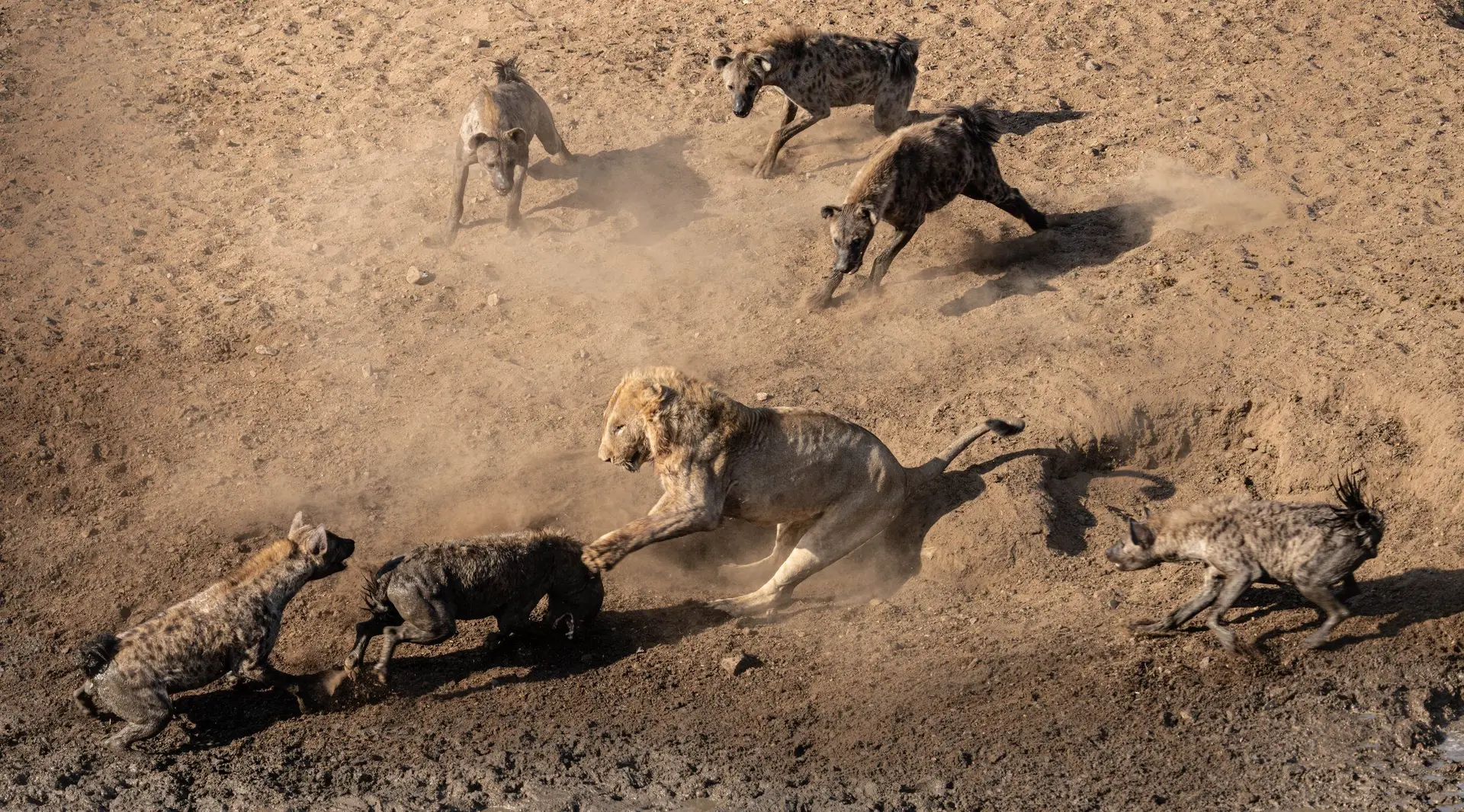 As the lion began to feed, I captured the scene through my lens, the quiet click of the camera punctuating the silence. The tranquility was short-lived. From the distant plains came the eerie cackle of hyenas and a chill sent down my spine even in the scorching heat. I had a feeling a confrontation was coming. I scanned the horizon and saw the telltale shapes of hyenas approaching, their numbers growing with each passing moment.
